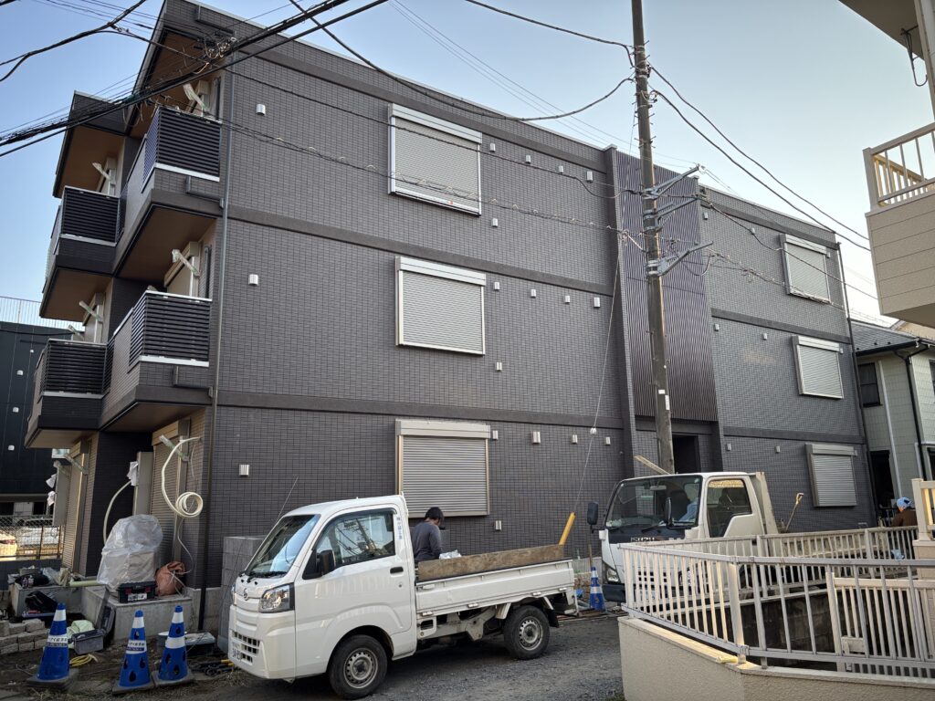現在は、すっかり外観を整えた鉄筋コンクリート造3階建ての賃貸マンションとなっており、外構工事を行っております。