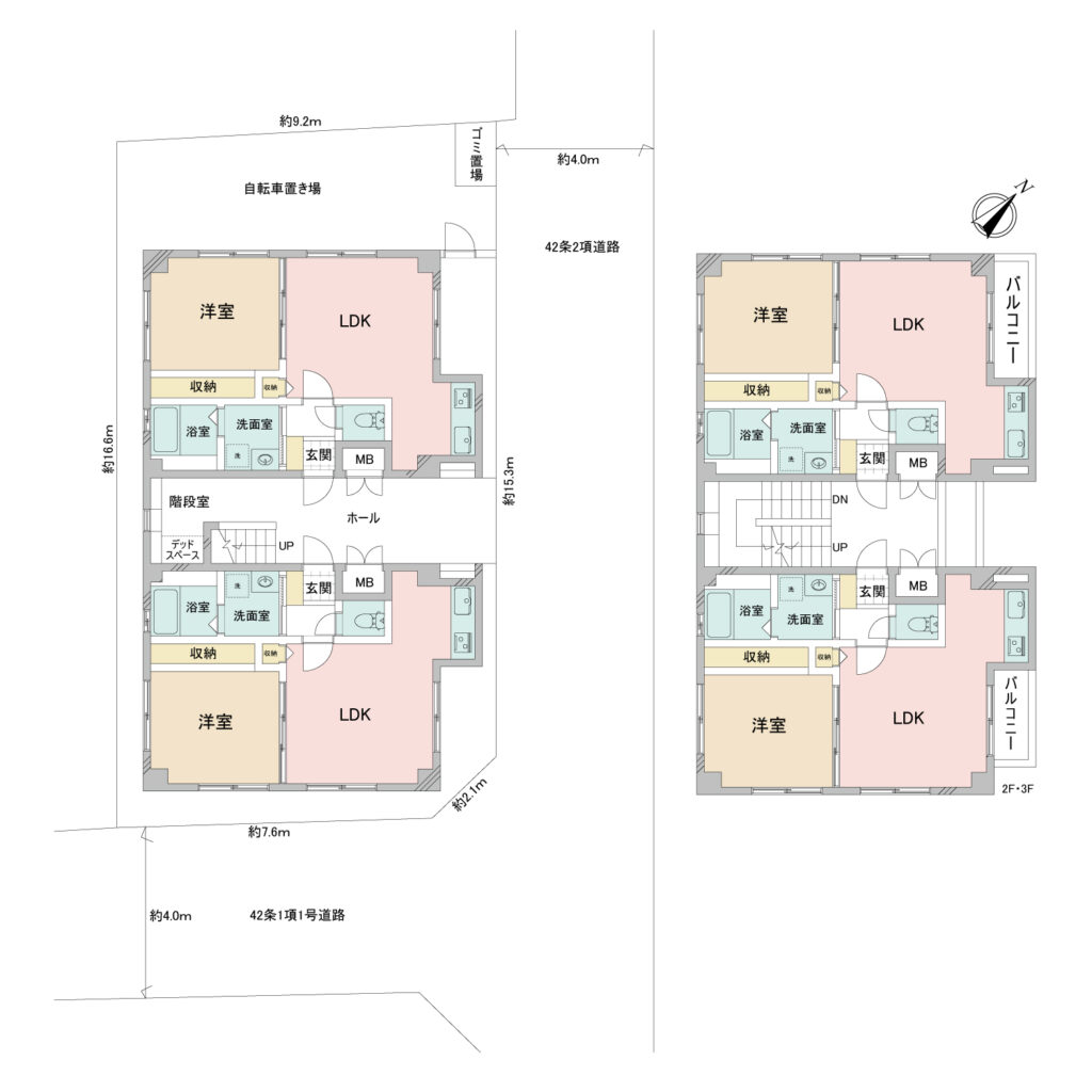 | 道路 | 南東側 公道幅員約4.0m / 北東側 公道幅員約4.0m (南東側道路:42条1項1号、北東側道路:42条2項道路) |